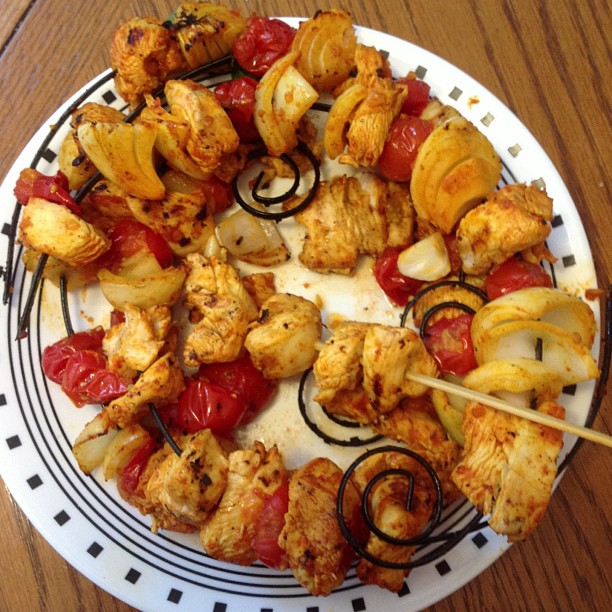 Soak some wooden skewers for a couple of hours, and put the veggies on with the chicken. Grill on medium heat until the chicken is done. Serve with onions, tomatoes, rice, and mint.
