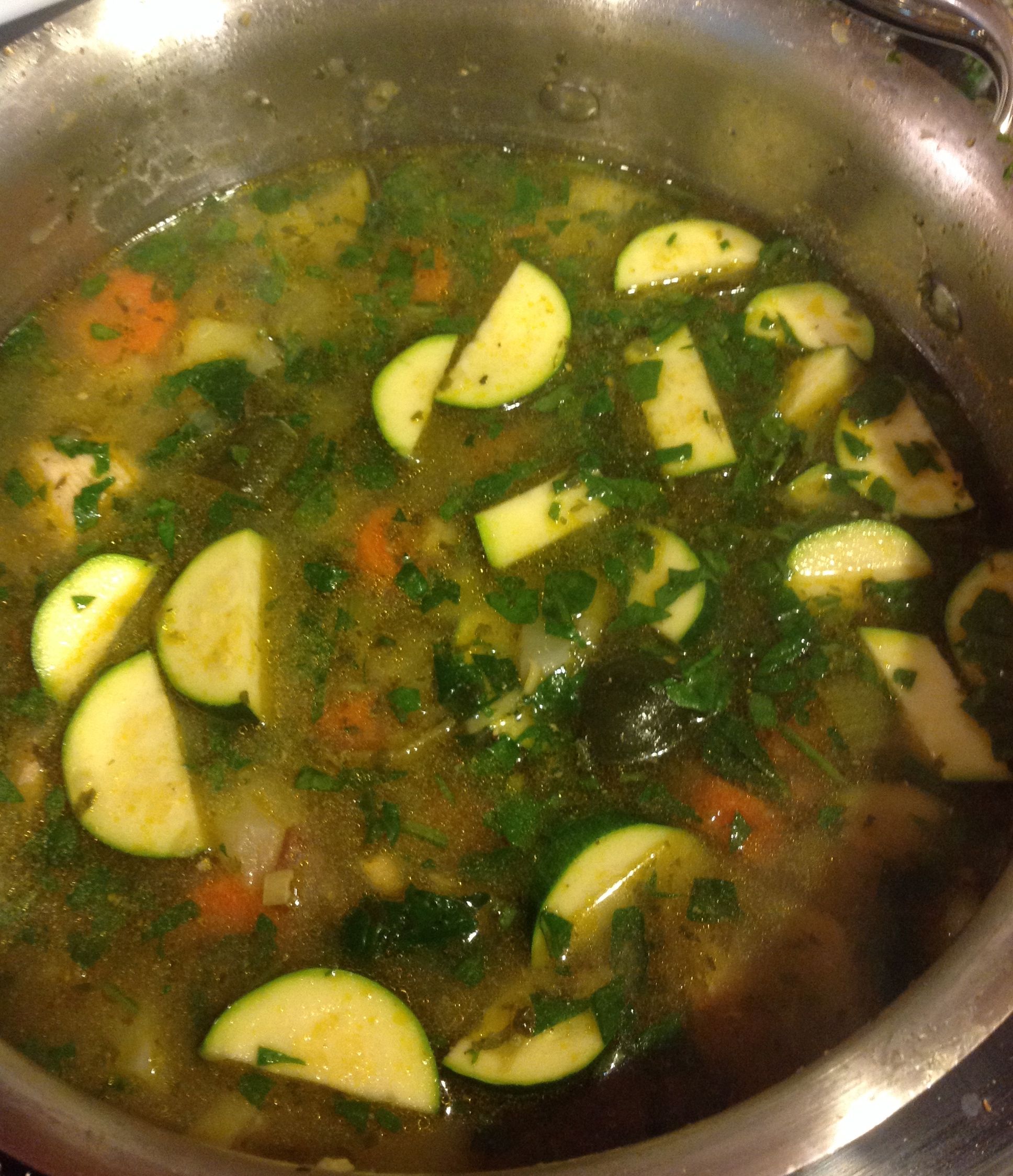 Stir in zucchini, spinach, and kale and simmer for 5 minutes.