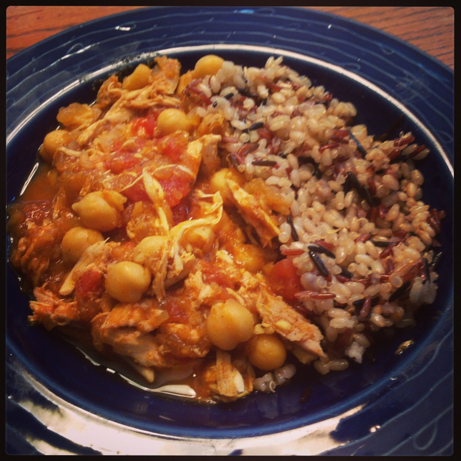 - Spread the chickpeas and shredded chicken in the bottom of the slow cooker. Pour in the tomato mixture over the chicken and chickpeas, and stir until everything is covered.