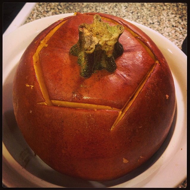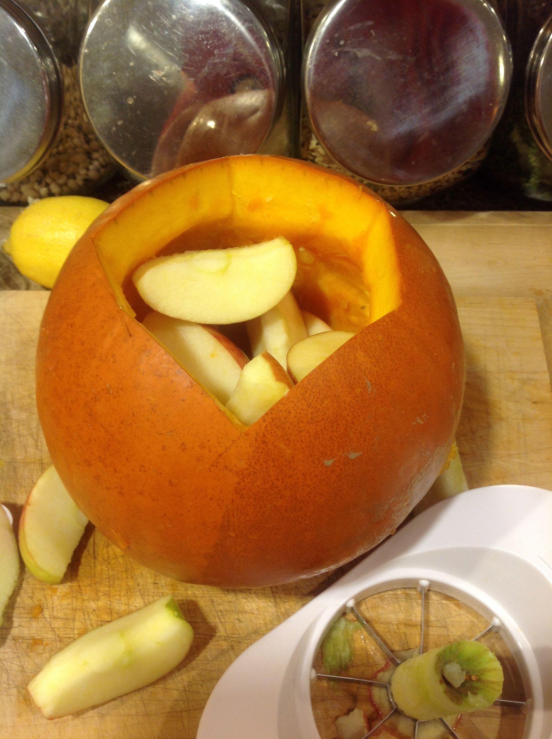 I have seen a couple of recipes for baked pumpkin floating about, but they all seem to use one cheese or another, which looks AWESOME! But we can’t eat cheese here. Boo. Then I started thinking about other things I could stuff into a pumpkin. Apples seemed like the obvious choice. (Read: apples were what I had sitting on the counter next to the pumpkin. If we’d had pears or oranges, this would be a very different dish.)
