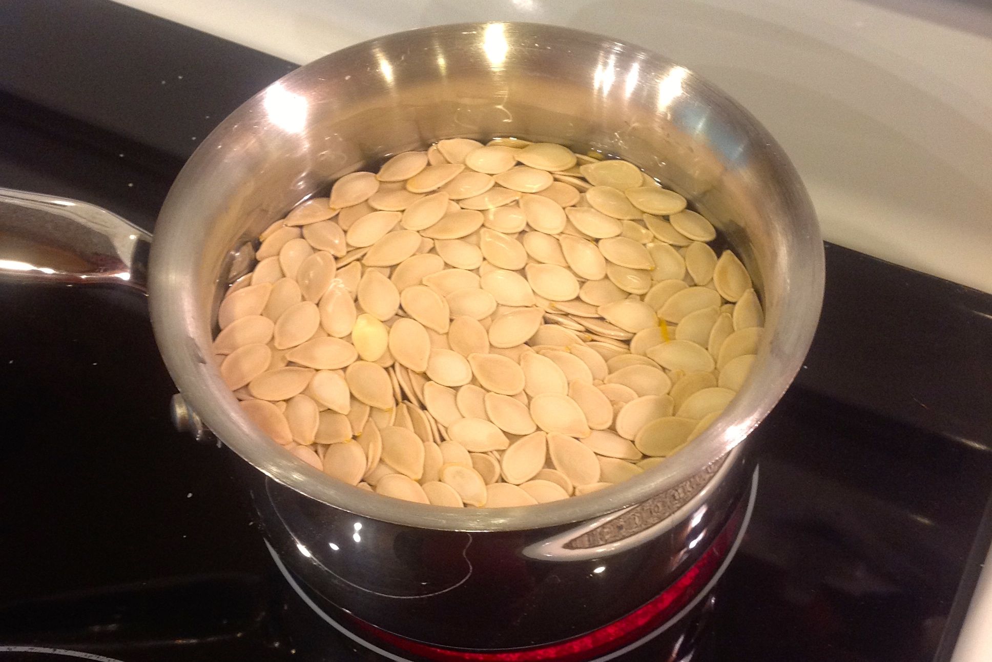 When rinsed, put the seeds and some salt in a pot of water and bring to a boil for a minute, then turn down and simmer for 5 minutes. Remove from heat and drain.