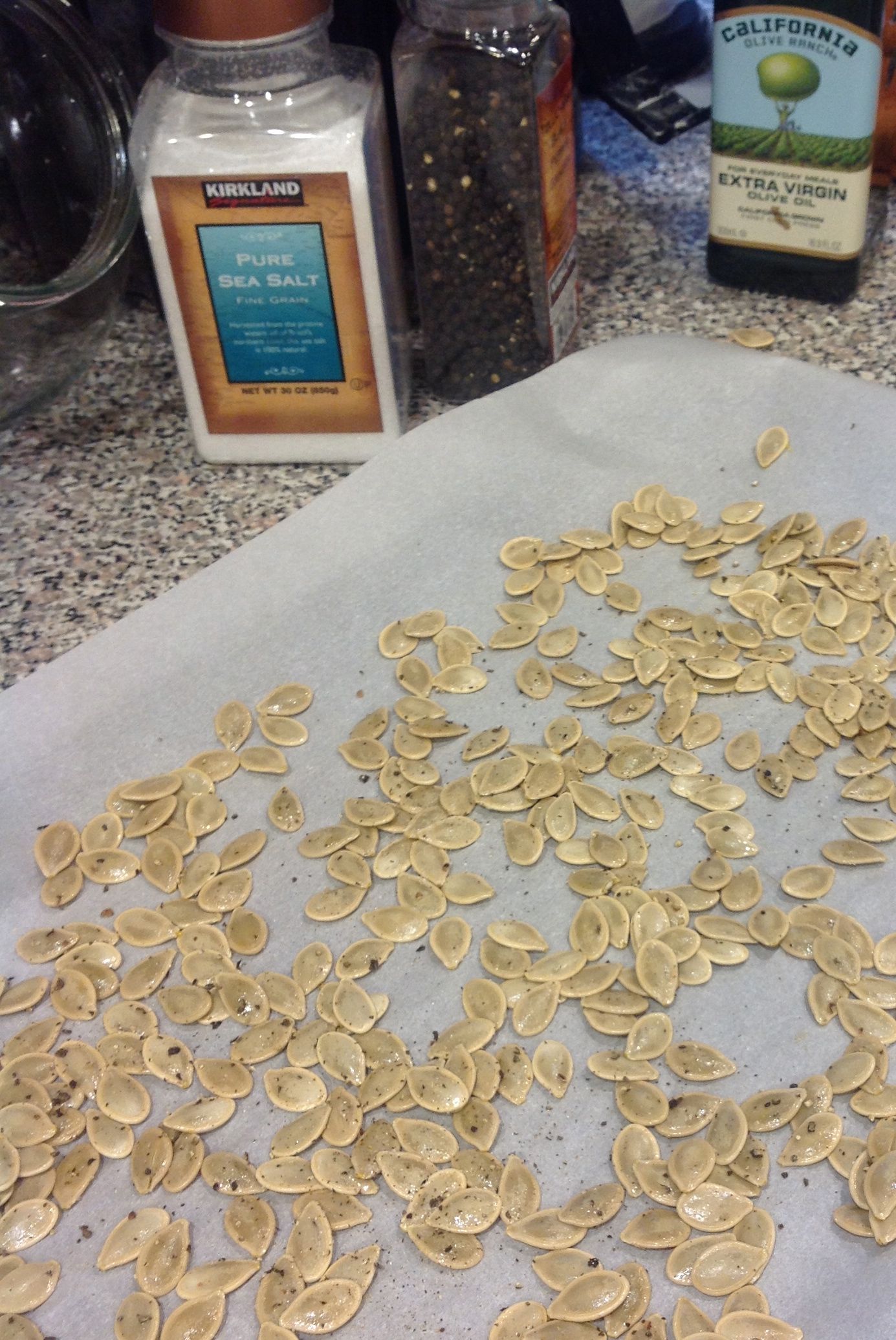 Dry the seeds on a plate with some paper towels, and transfer to a lined cookie sheet. Add about a tablespoon of olive oil, making sure it covers all of the seeds. Salt and pepper to taste.
