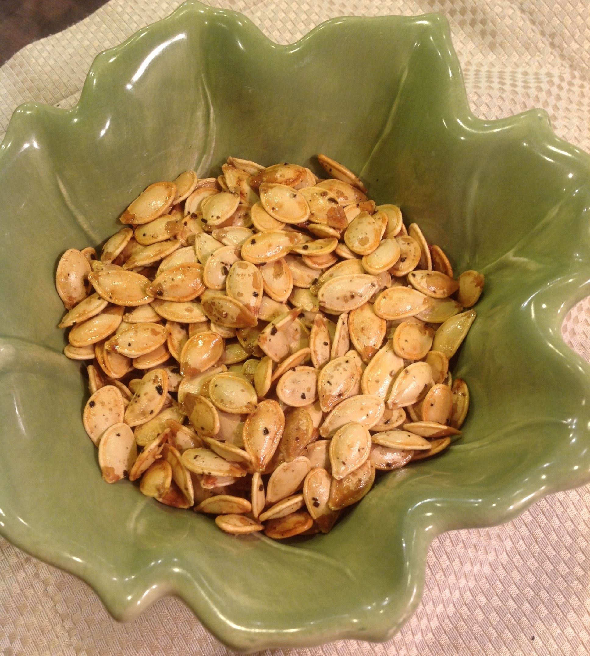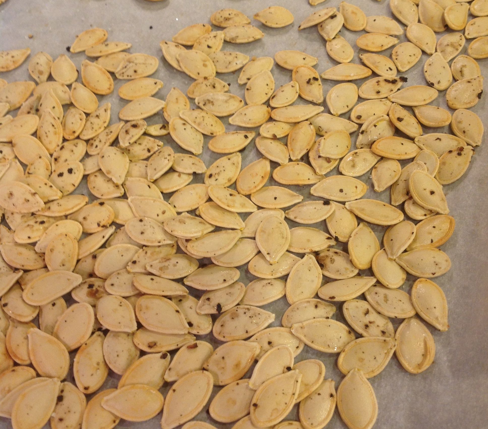 That pumpkin we roasted last weekend is the gift that keeps on giving. I put the seeds and some of the guts of the pumpkin in the refrigerator for a few days so I could roast them when I got around to it, which turned out to be today.