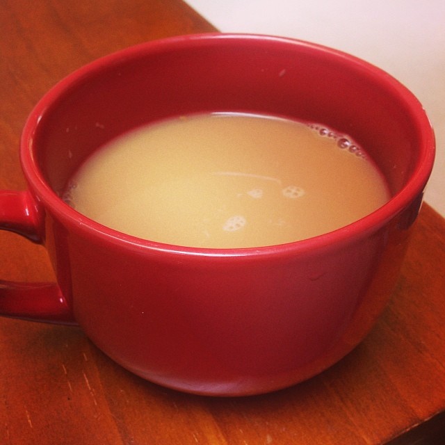 Bring to a boil again, remove from heat and add tea. Cover and let steep for 3 minutes. Strain through sieve, and put liquid back into the pot. Stir in brown sugar, honey or maple syrup and milk or soy milk on low for a minute or so. Serves 2, or if you are me, 1.