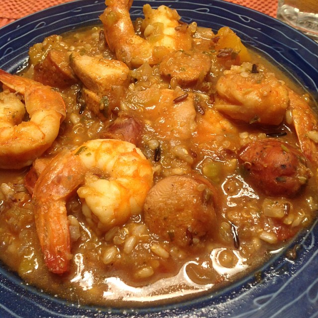 When I make jambalaya, I typically like to caramelize the vegetables with some butter in a dutch oven, and then add everything else and cook for an afternoon, but I was feeling a little less than motivated, so woohoo! Slow cooker! This is a lot of food, so if you don’t cook for 6 or if your slow cooker is smallish, you can halve this recipe. If you don’t have a slow cooker, you can use a stock pot or dutch oven on your stove instead.
