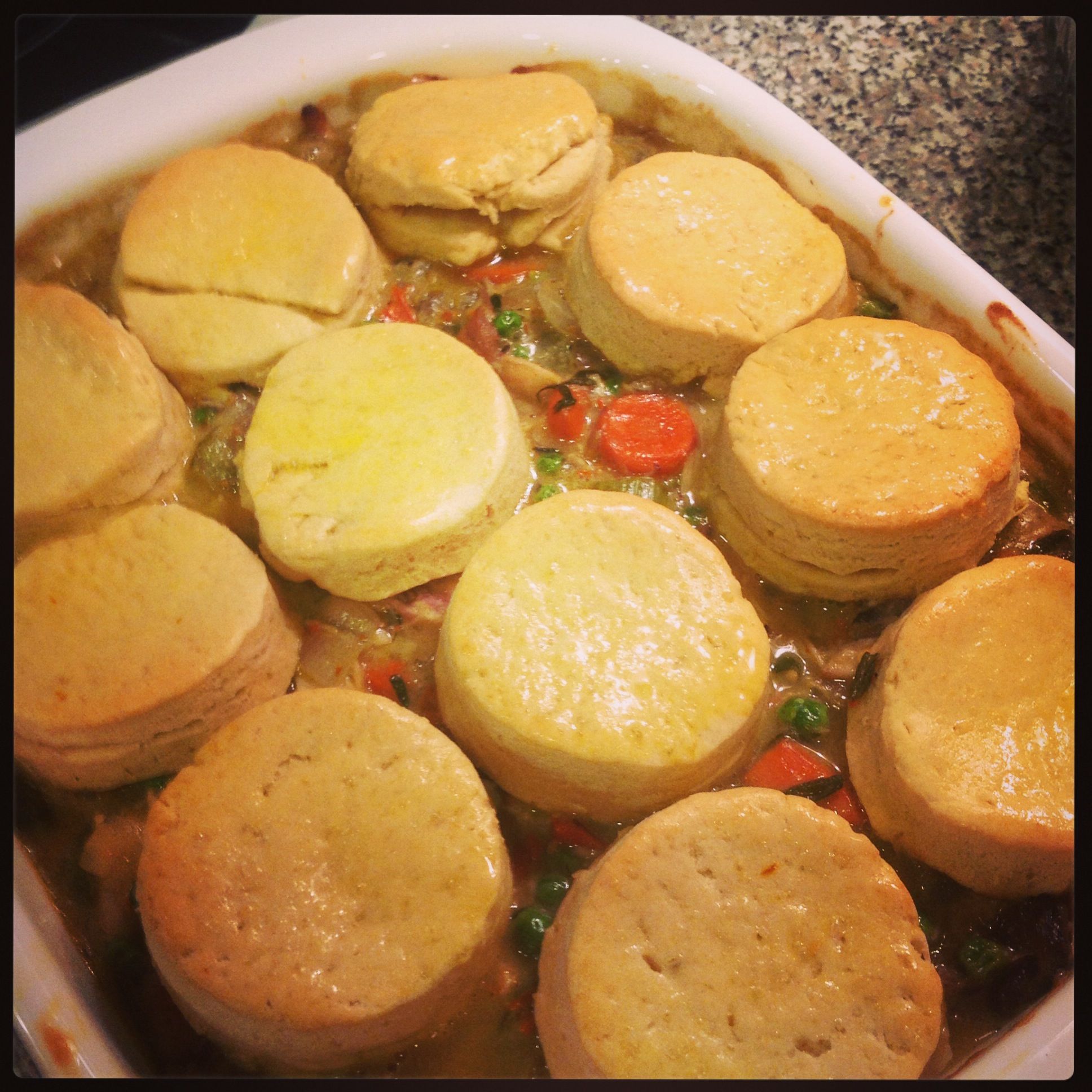 Melt butter in a skillet and brown onions. Add celery and carrots, and cook for about 10 minutes. Add peas, parsley, thyme and flour. Cook and stir until the flour coats vegetables. Add chicken stock and cream, cook until the mixture thickens. Add salt and pepper to taste, and add chicken. Transfer to baking dish, and arrange biscuits on top of the filling. Brush with egg yolk/water mixture, and bake at 350 for 25 minutes, or until biscuits are brown.