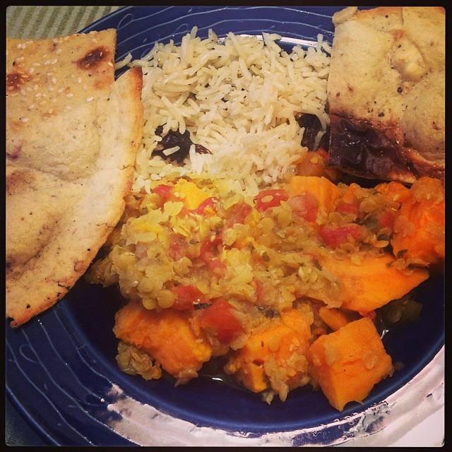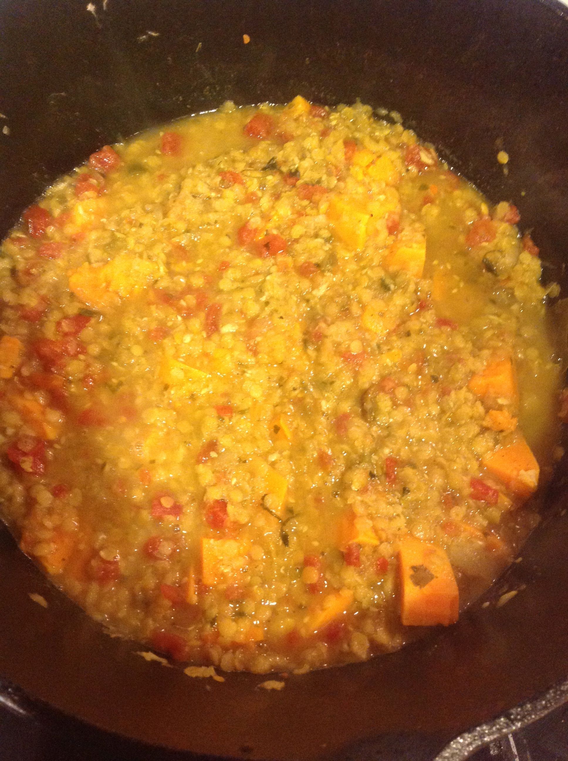 Add lentils, sweet potato, tomatoes, vegetable stock, and bring to a boil.