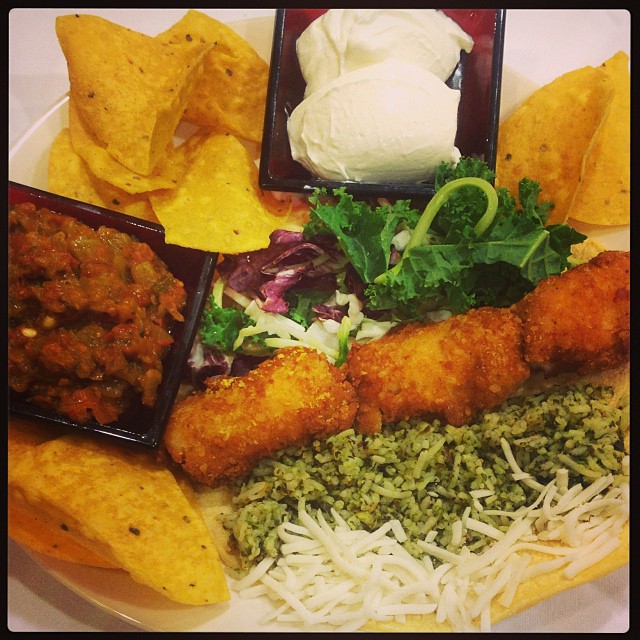 Serve with whatever you’d put on a fish taco! We ate it with leftover rice, soy cheese, shredded cabbage/kale/spinach mix on corn tortillas. (I had a little sour cream. Totally worth it.)