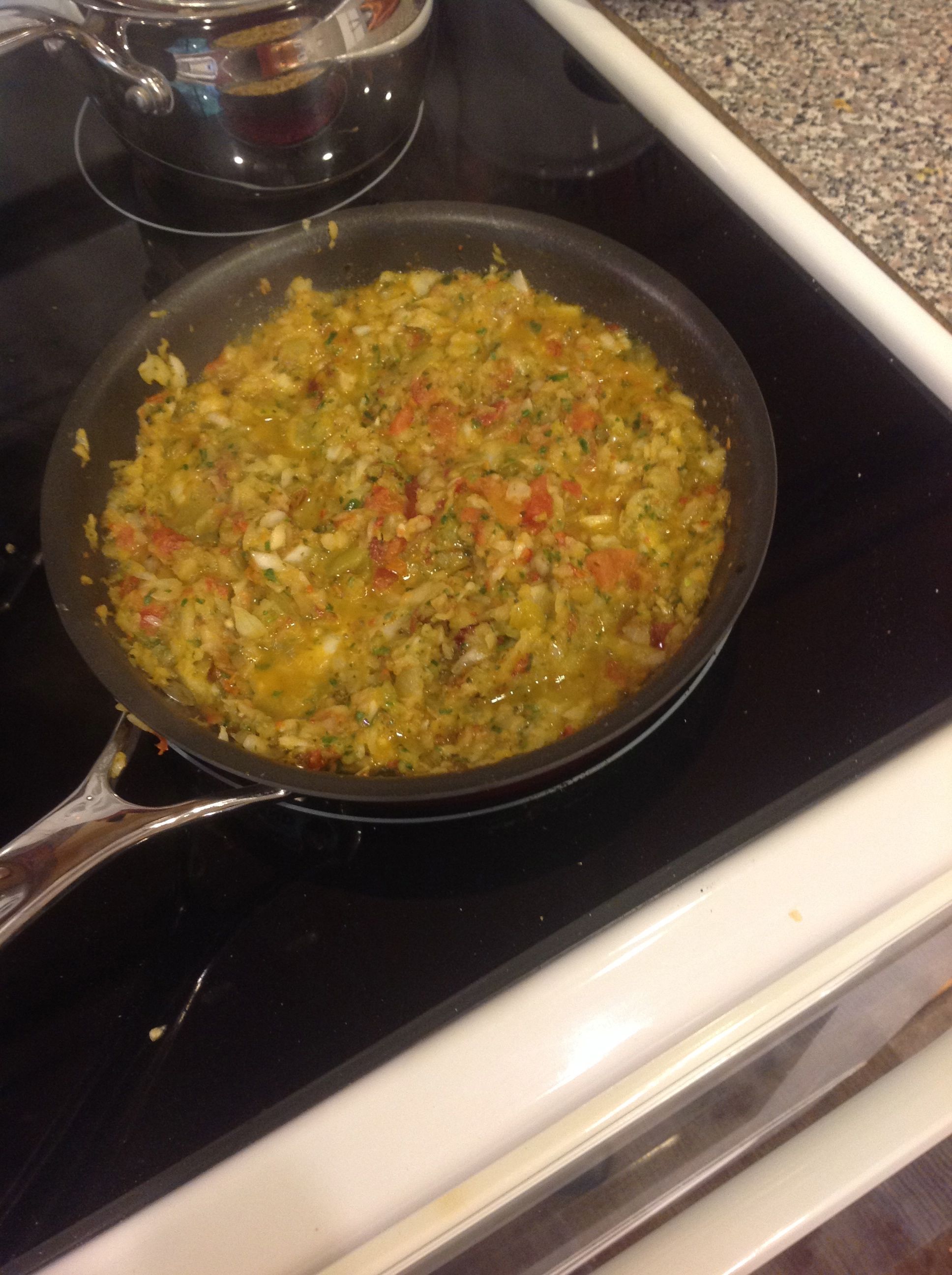 Heat a pan at medium high and sautée that onion/tomato concoction plus any spices you think would be good. (I used chili pepper, crushed red pepper, and smoked paprika and it was *spicy*) until it reduces down to a salsa like consistency, and has caramelized just slightly.