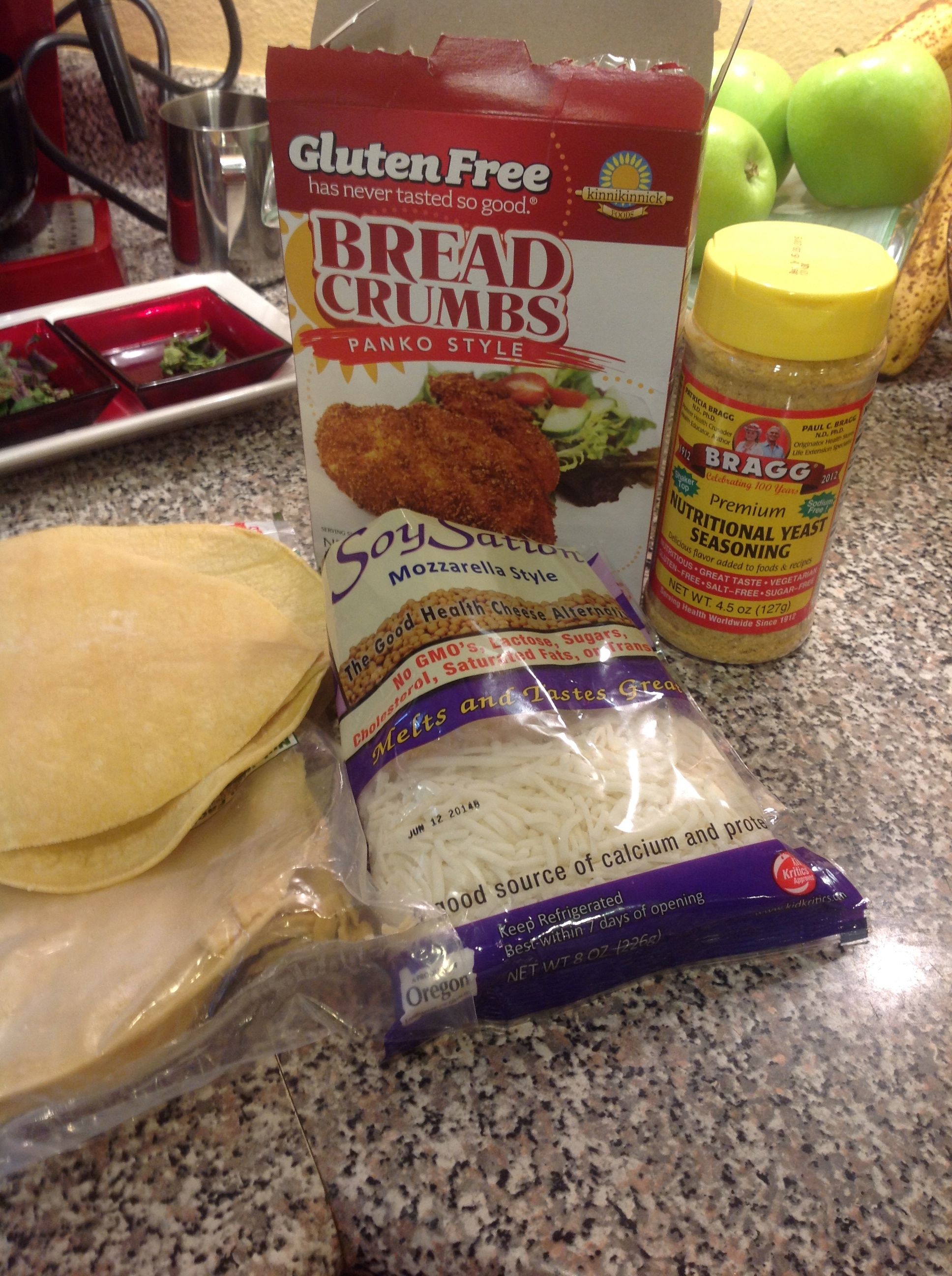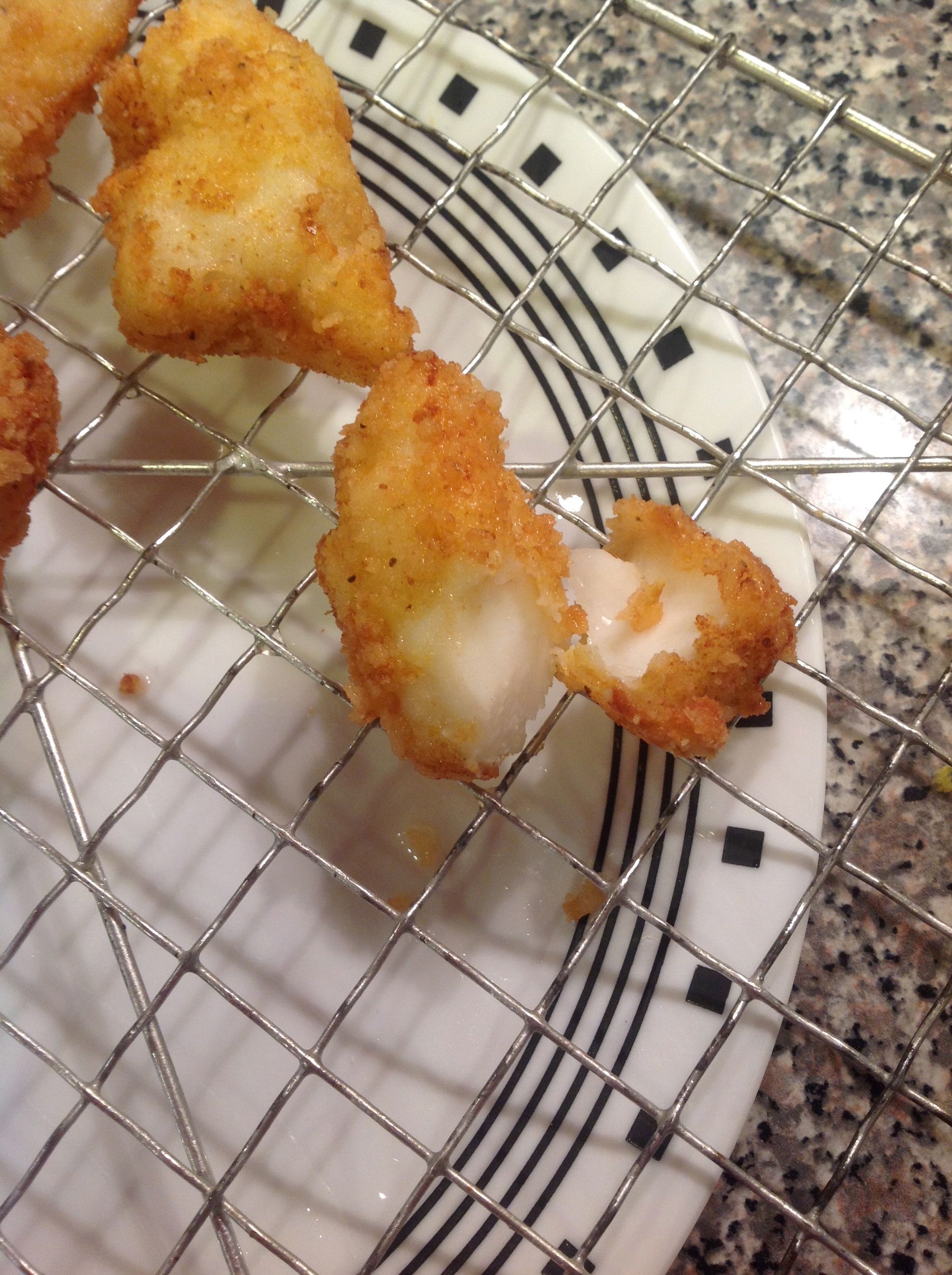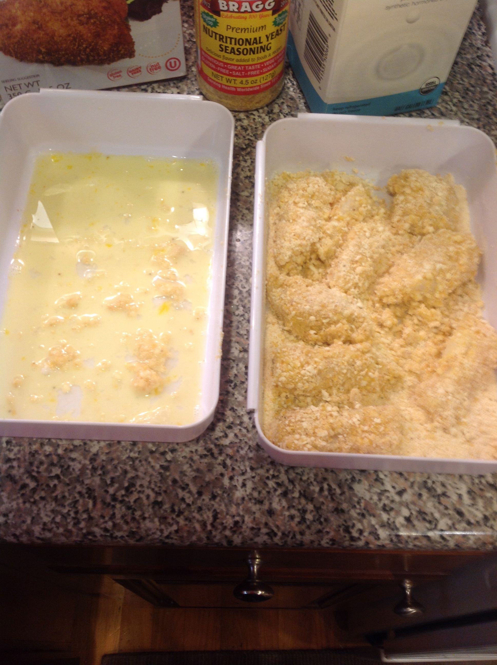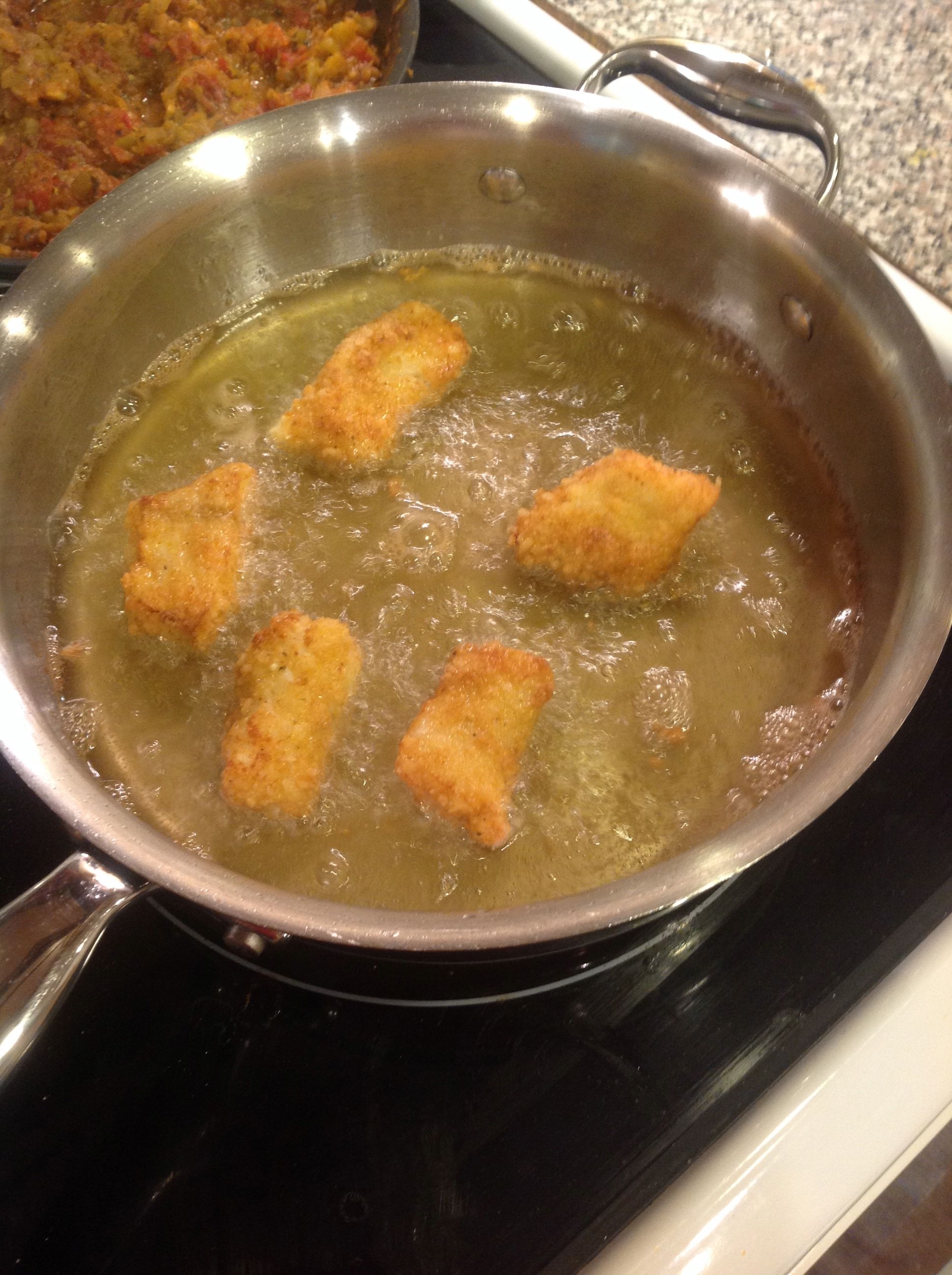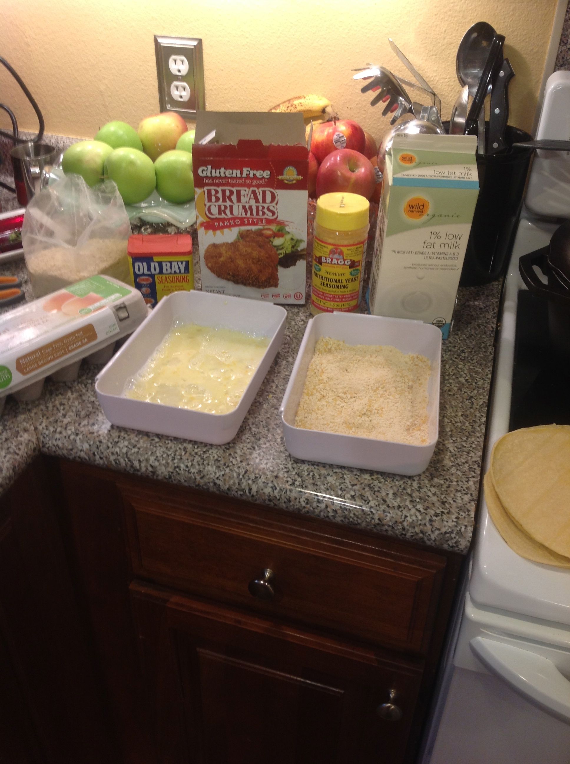 Pat the fish dry, and drag it through a milk and egg wash. Drag through gluten free panko breading seasoned with whatever you like. (I used Old Bay and nutritional yeast.) Repeat the wash and breading drag, and fry until brown in 1-2 inches of high smoke point oil. (I used Smart Balance vegetable oil.)