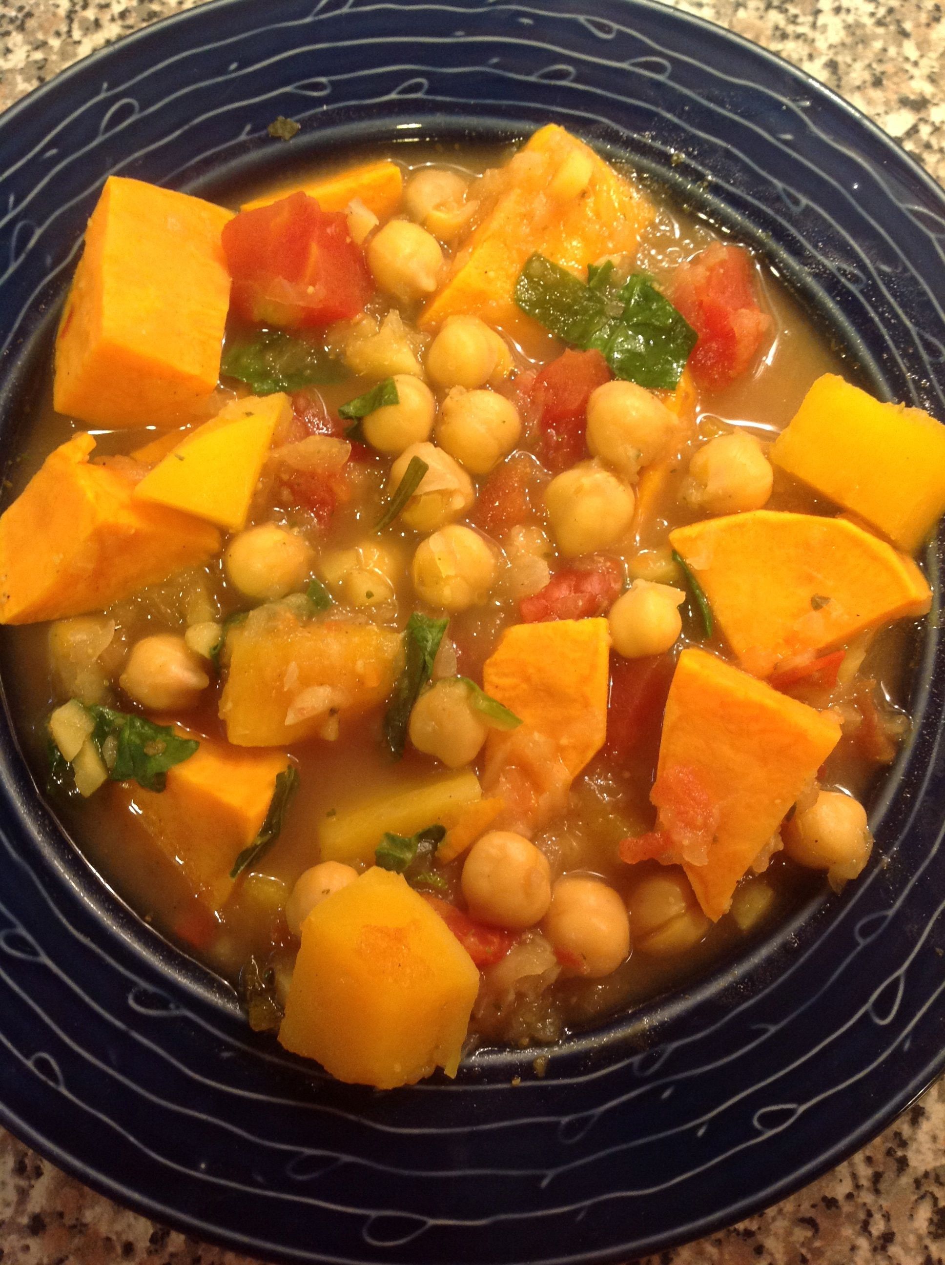 In a stock pot, sauté onions, garlic, ginger, yam, sage, and rosemary until fragrant. Add in tomatoes, spices and squash. Bring to a boil, and cook for 15 minutes on medium low. Add in the chickpeas and spinach, and cook for another 10 minutes, or until the yam and squash are soft.