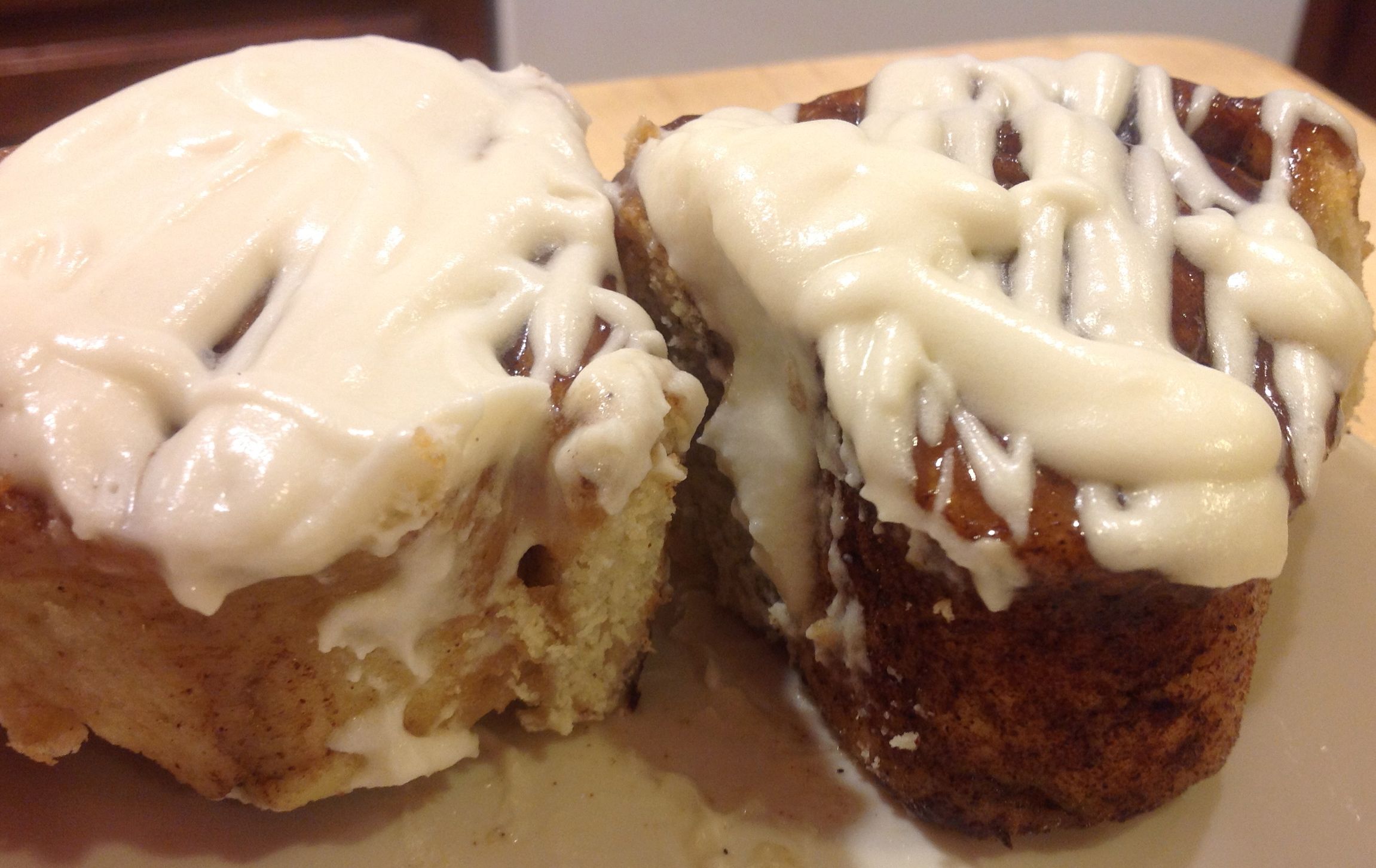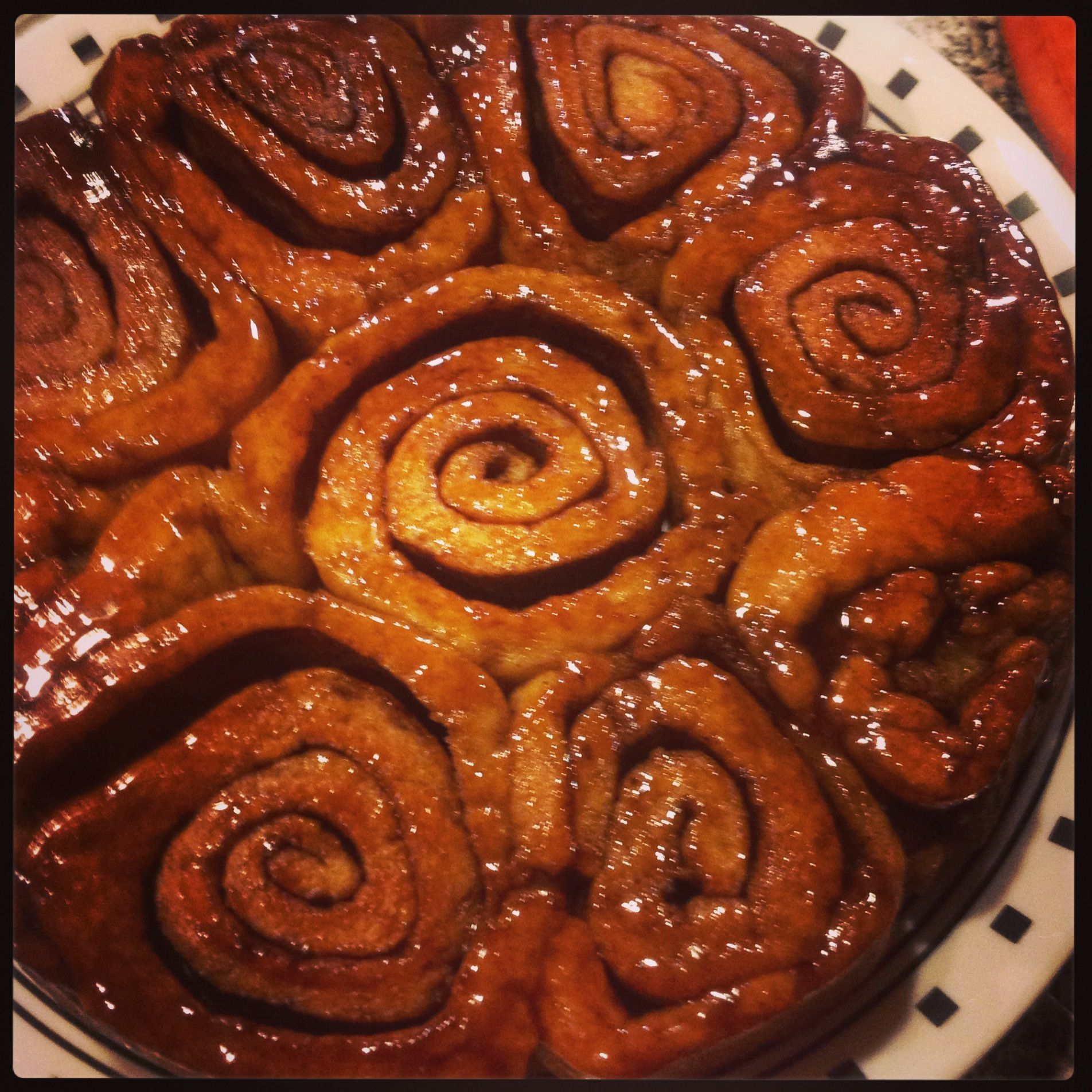 Combine the sugar and cinnamon and sprinkle mixture over the dough from edge to edge. Pick up the short end of the wax paper and roll the dough over on itself until you reach the end. Cut the roll into 1 1/2 inch pieces and put the discs into an 8×8 greased pan. Let rise for 30 minutes, then bake at 375 for 20-25 minutes. Cool until the butter stops bubbling, and then flip out onto a plate.