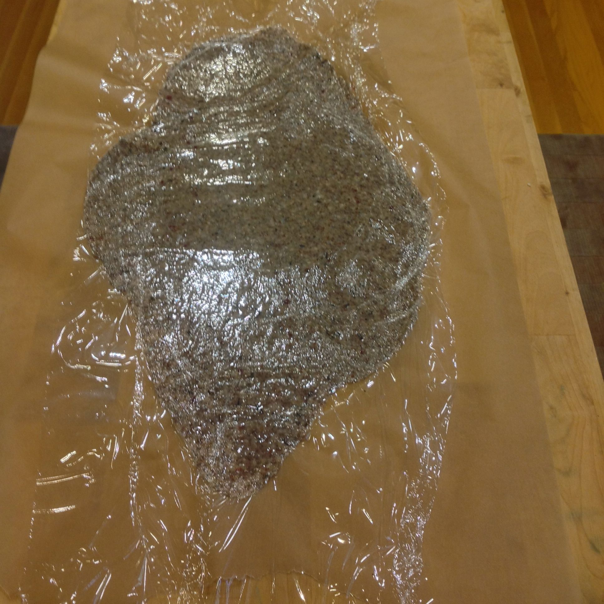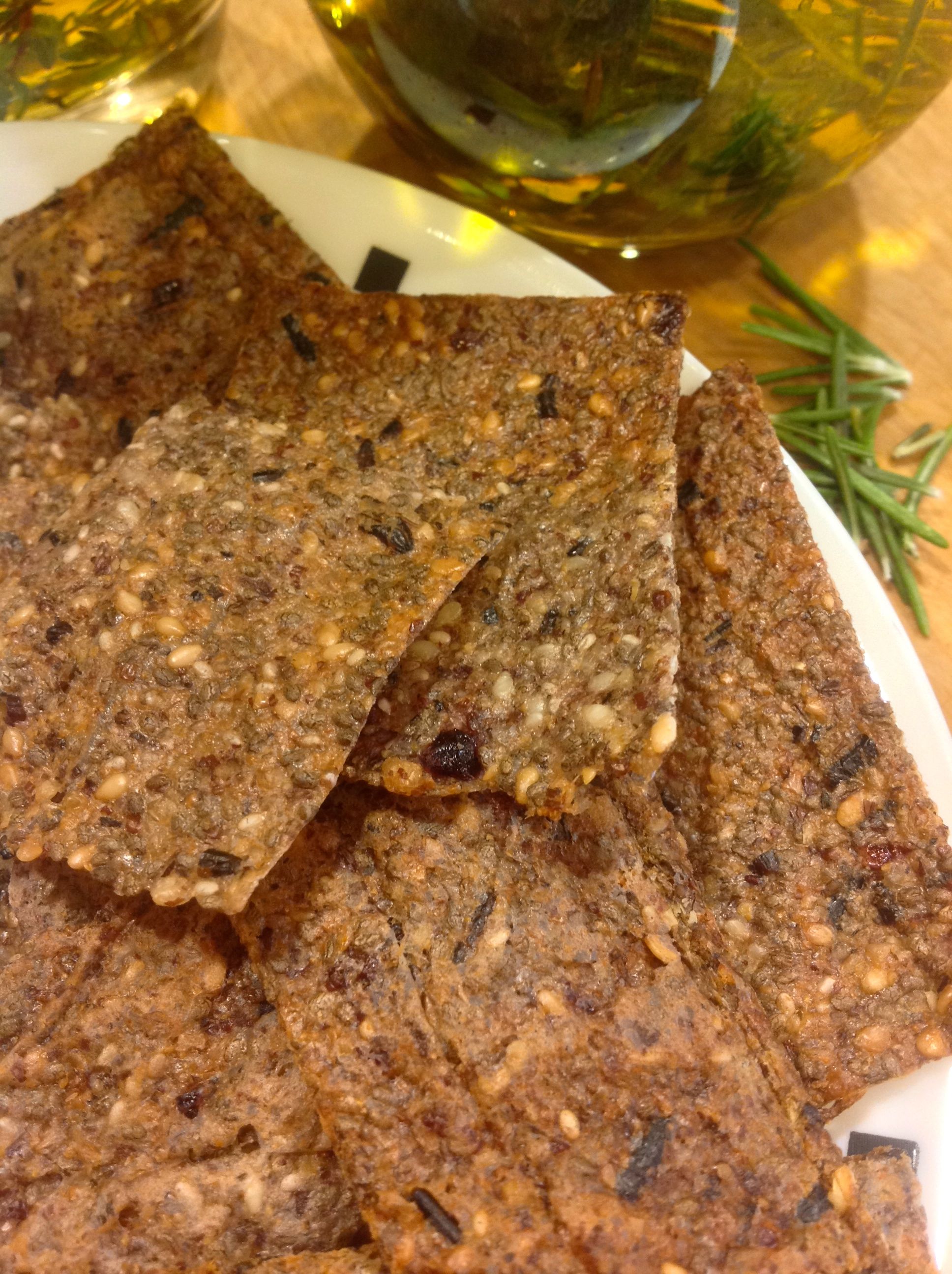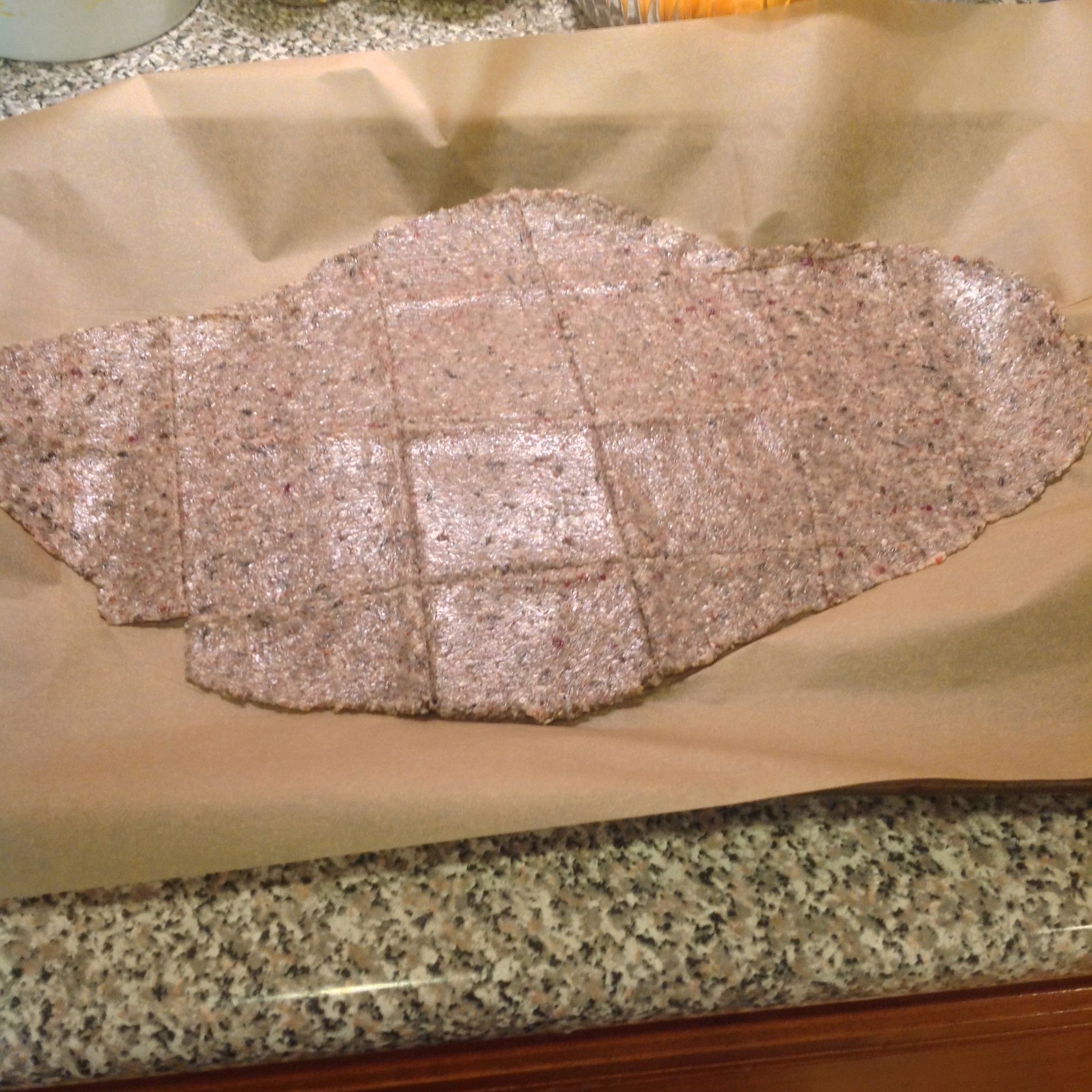 Bake for 10 minutes on 350, take out and flip onto another piece of parchment, and bake for 10 more minutes. Take out and break the pieces apart over the scored areas, and bake for 10 more minutes. The pieces on the edges were a little thinner than the middle, and baked faster. I just took them off and called them lunch, and let the rest of the crackers bake until they were done. I think I hear some hummus calling my name.