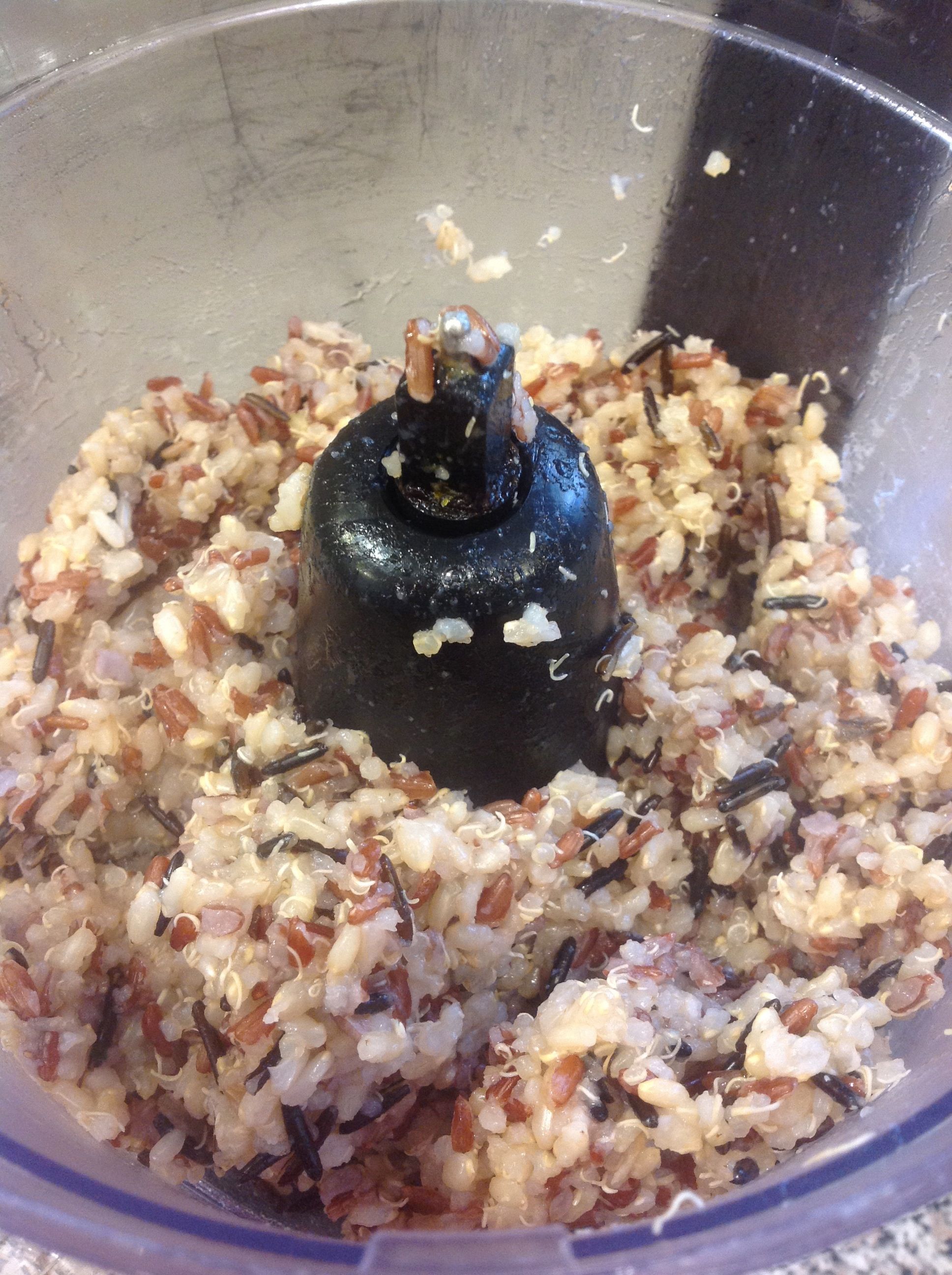 Mix the rice and quinoa in a food processor until it is the consistency of cooked oatmeal.