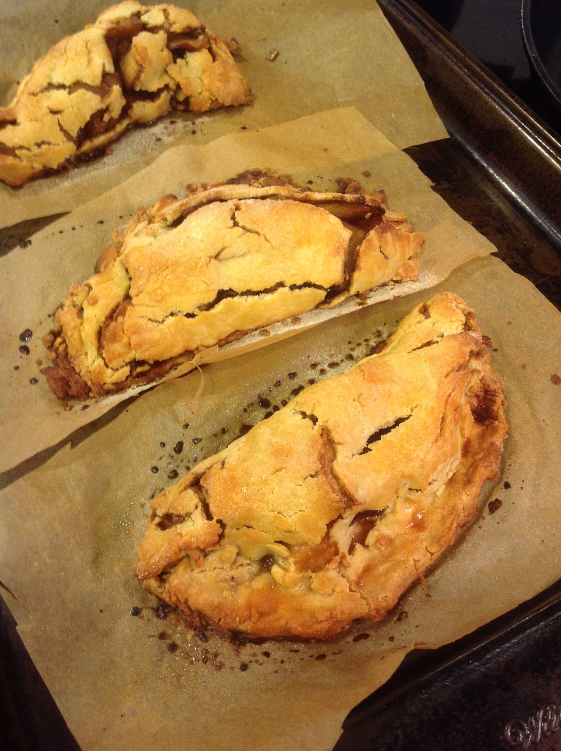 We thought about apple pie and applesauce and apple butter (which I will probably make tomorrow), but what really caught our eye: apple turnovers. We looked around for a recipe, and decided to go with this one. Since it wasn’t gluten free, we used this gluten free pie crust recipe, and followed the rest of the recipe (and great video!) here.