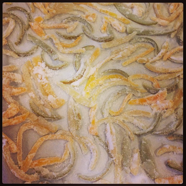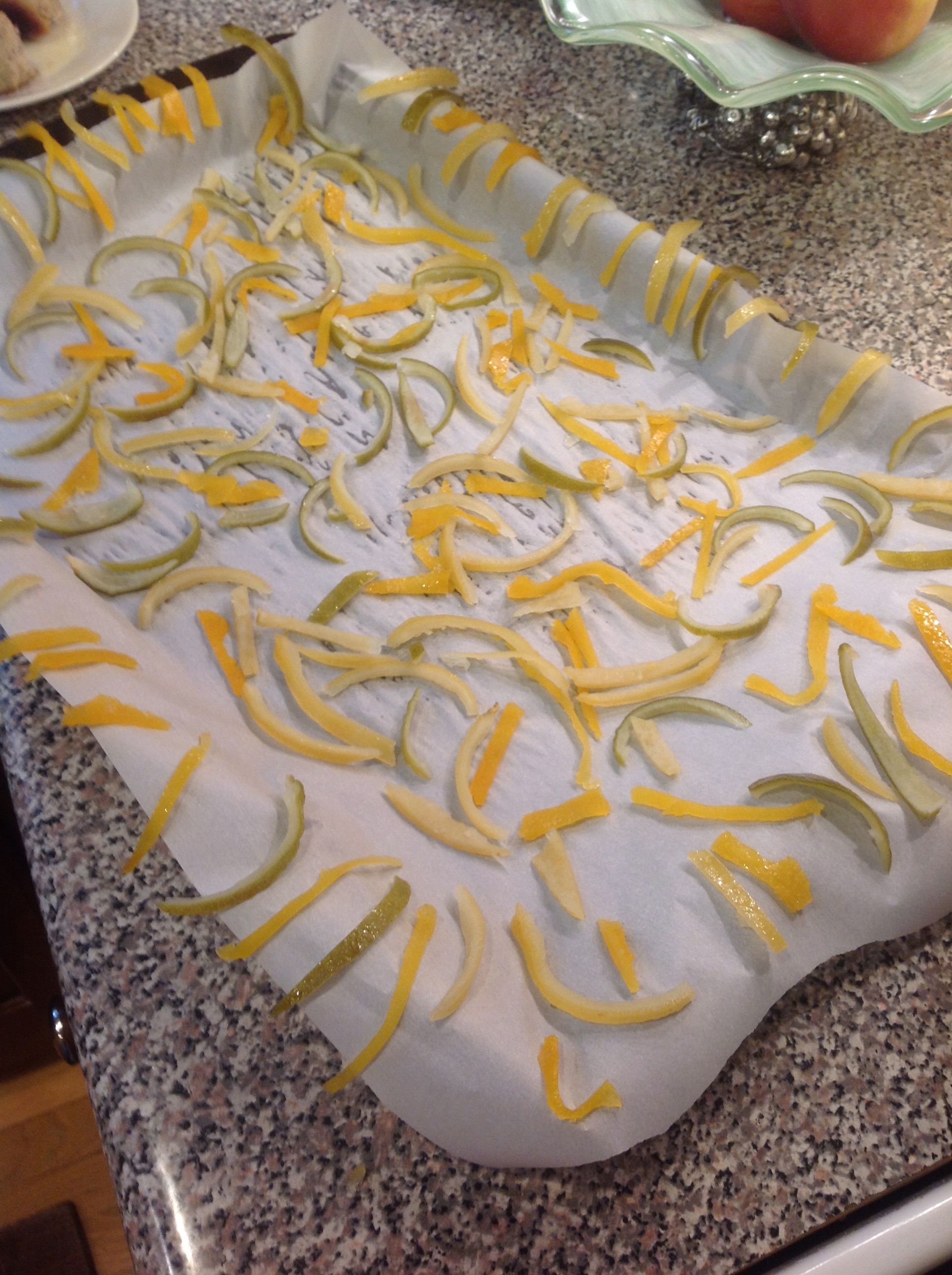 Drain (saving the liquid if you want…it’s essentially a citrus syrup), and let rest for half an hour or so on some parchment paper.