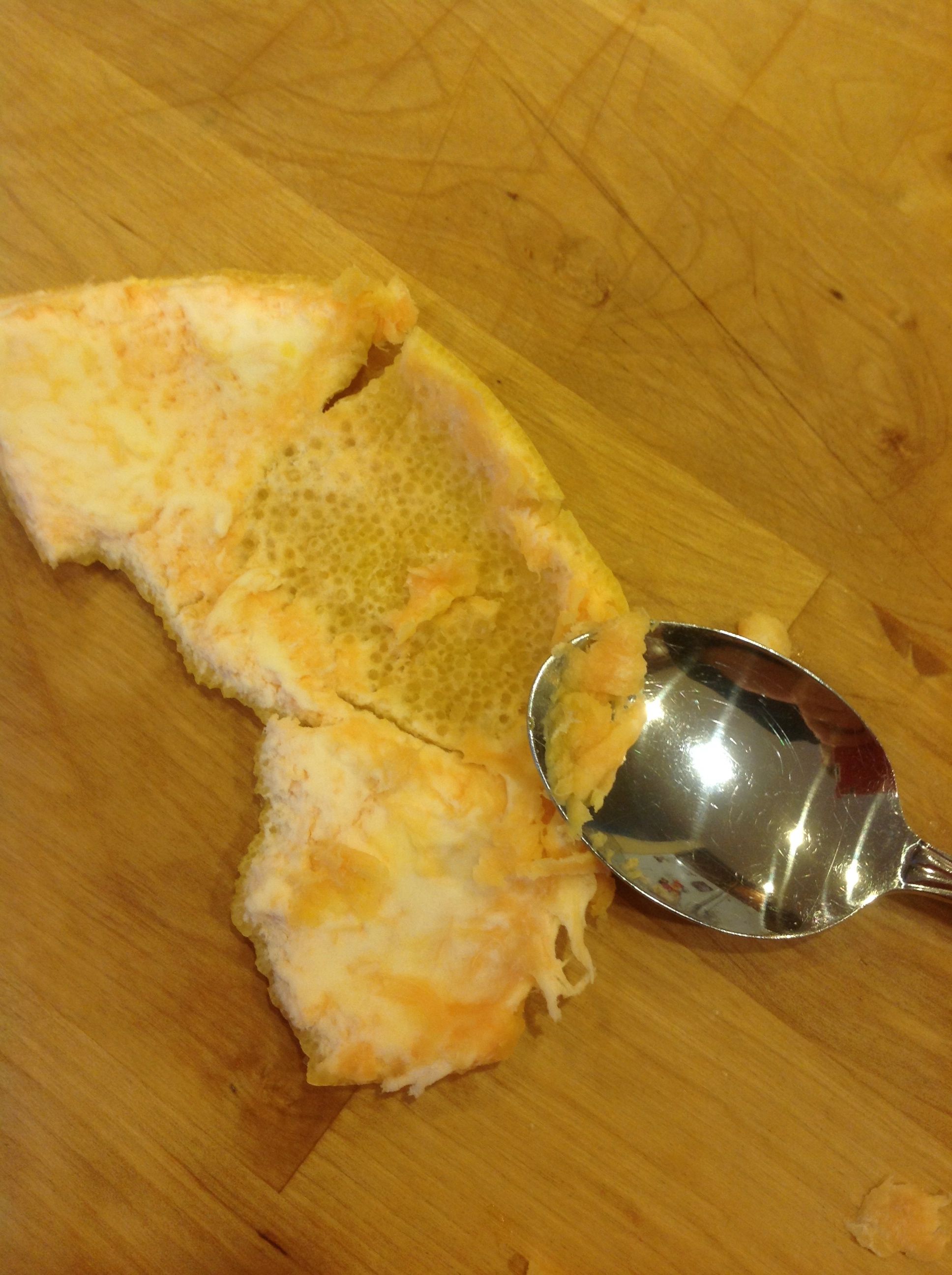 Then used a spoon to remove as much pith (the bitter white stuff inside) from the peels.