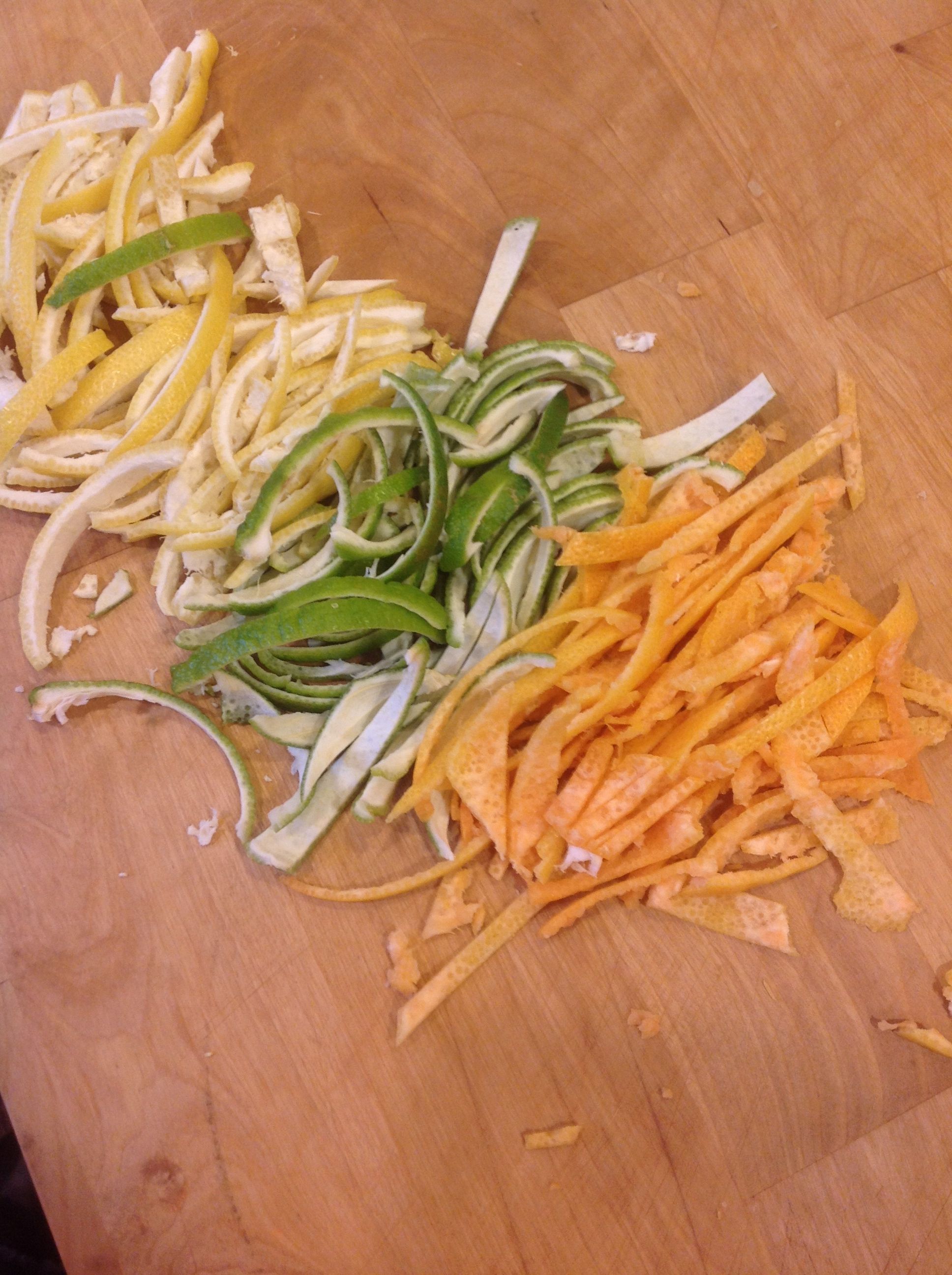 So, we decided to also make a vegan version of this pie, which entails using candied fruit. I took a look at how much the grocery was charging for candied fruit, and how many preservatives were used, and decided to make my own, since no one here can tolerate nitrites or nitrates. That way I don’t even have to throw and citrus rinds away! Oh, it makes my frugal heart sing, it does.