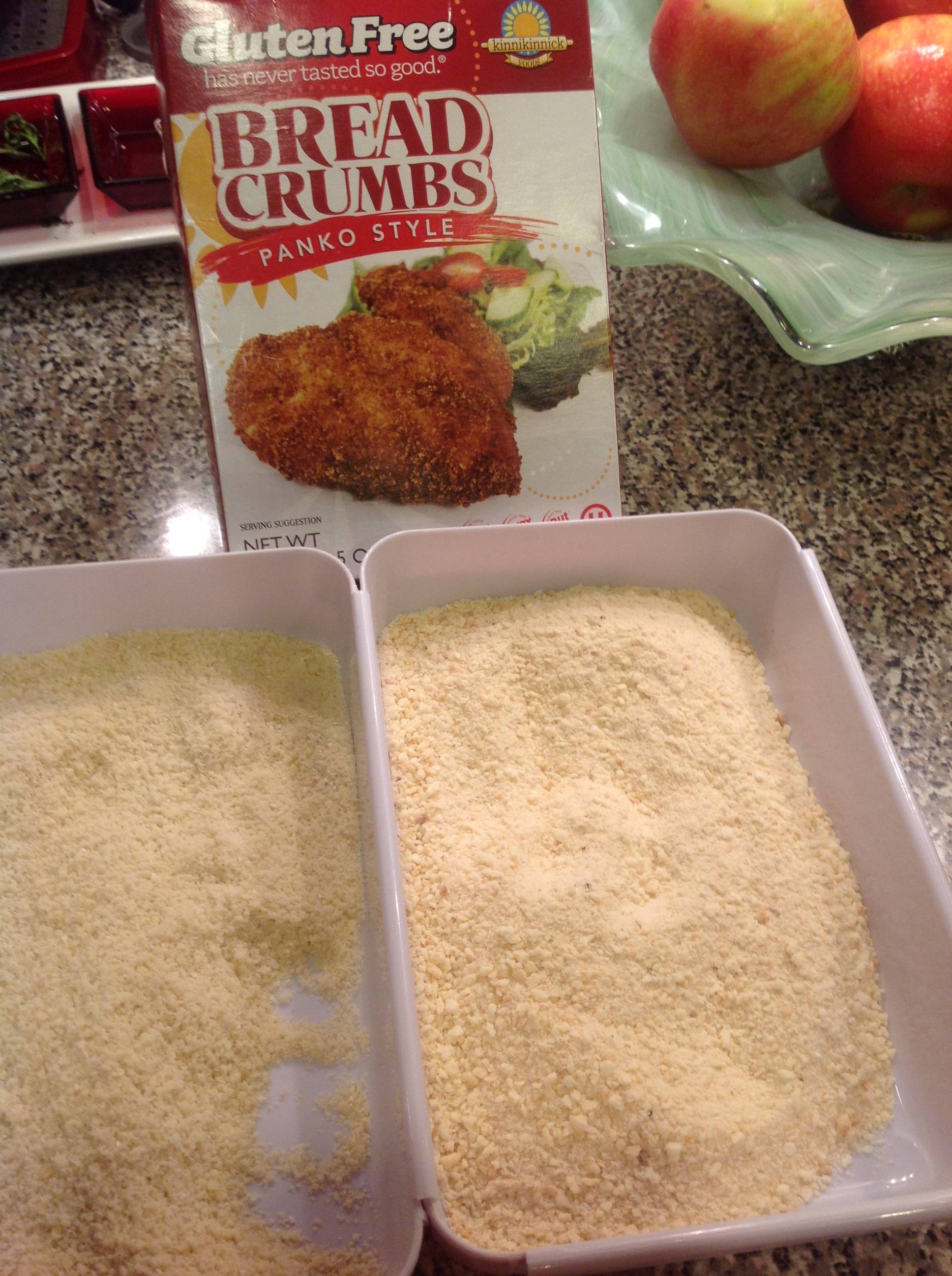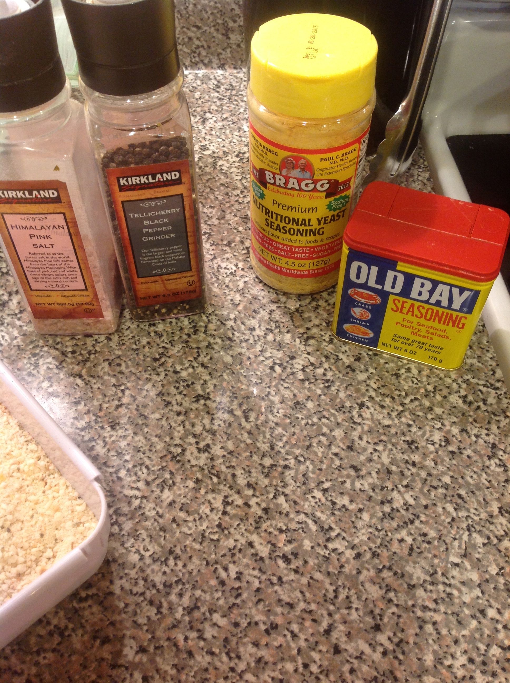 - season bread crumbs to taste with salt, pepper, old bay, paprika, cayenne, nutritional yeast…whatever you like.