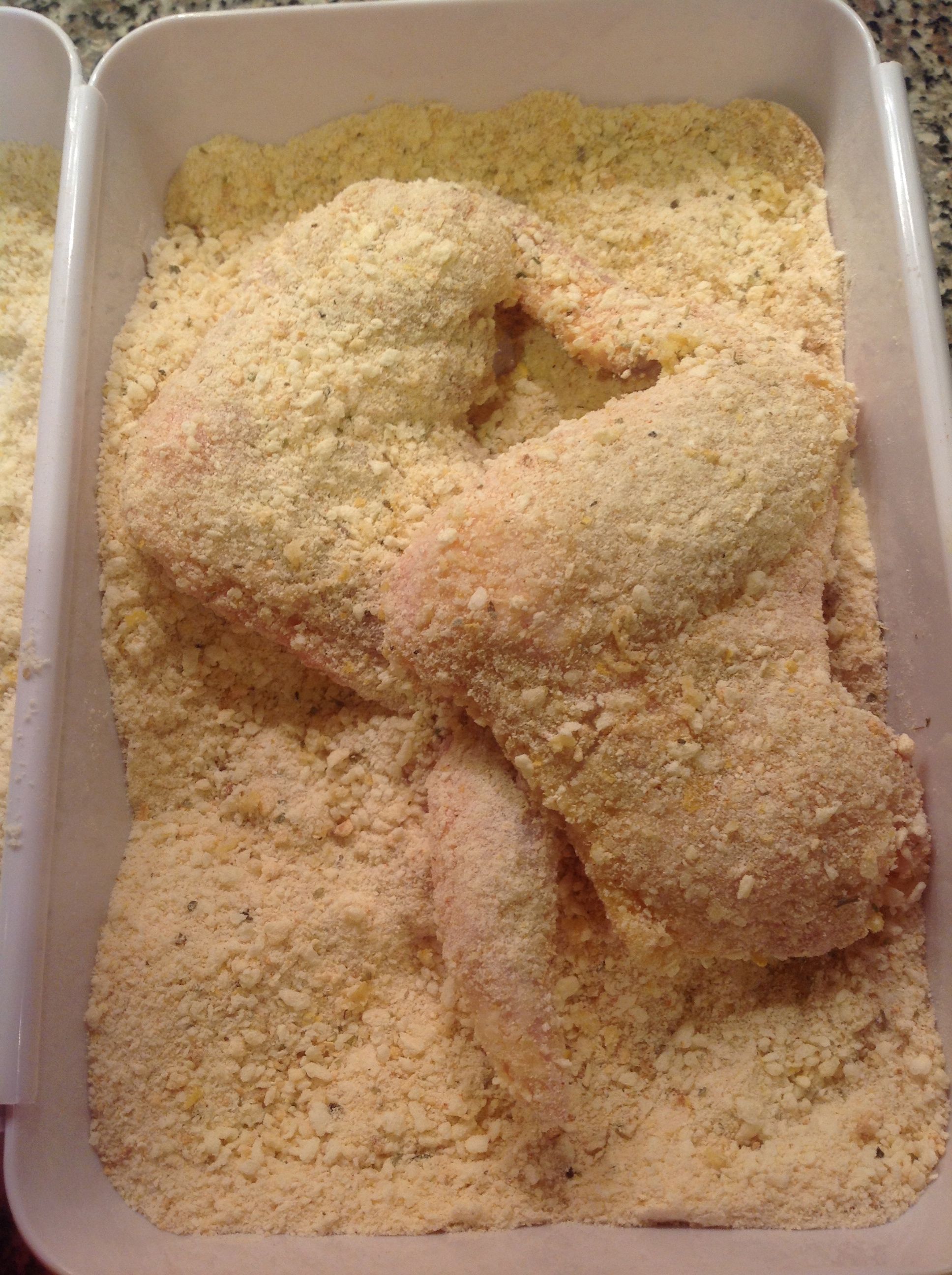 Drag the the chicken through the egg wash, coat in the almond/oat flour. Then dunk it briefly back into the egg wash, and then drag it through the bread crumbs.