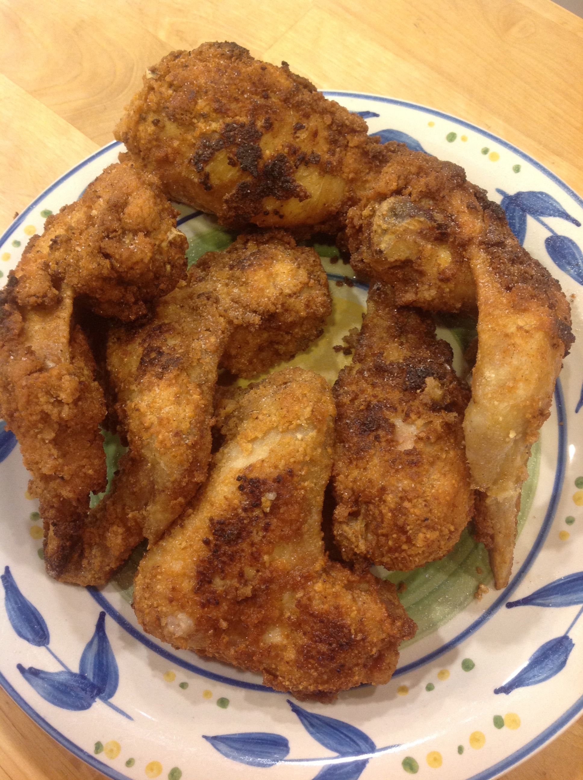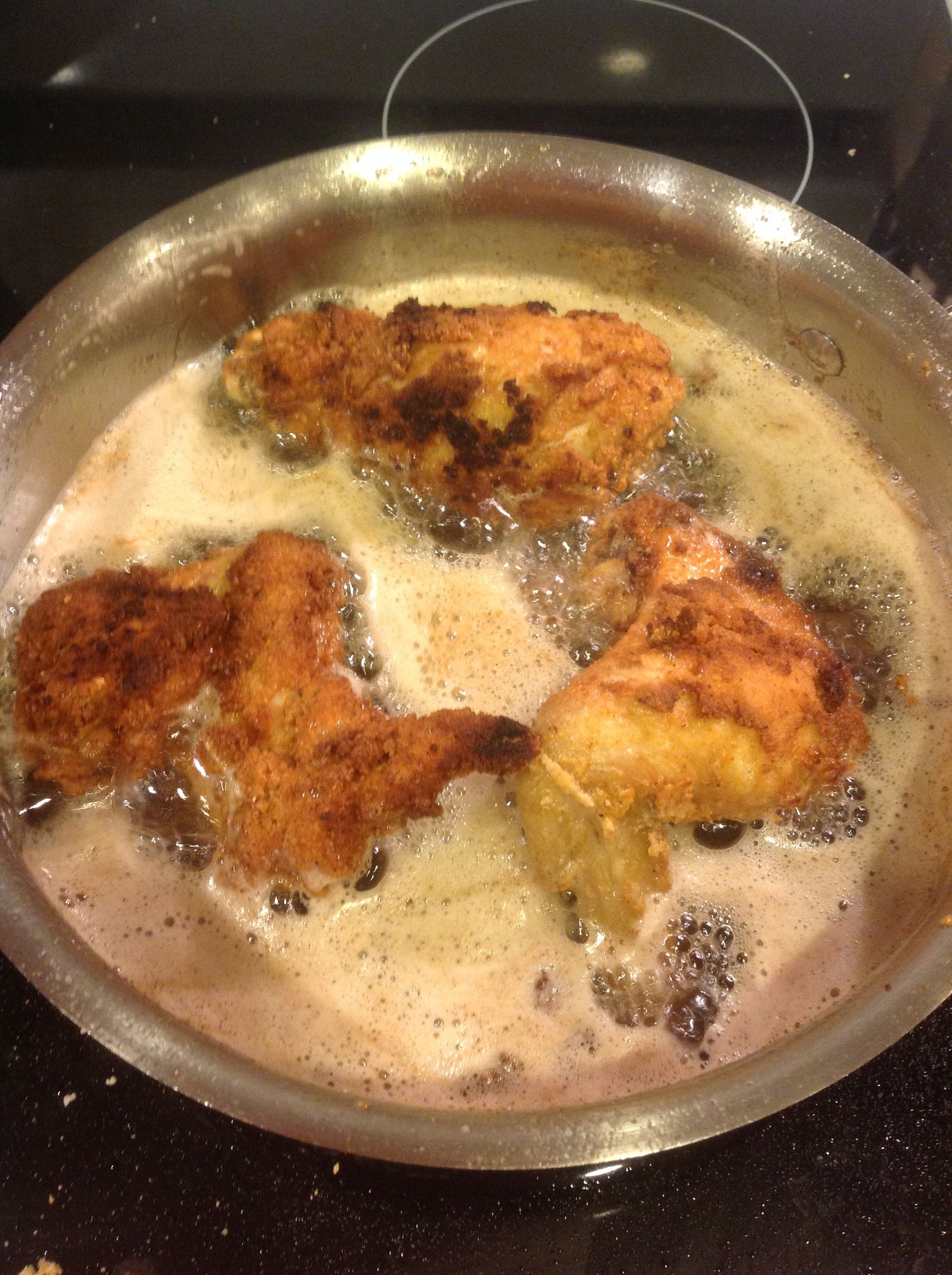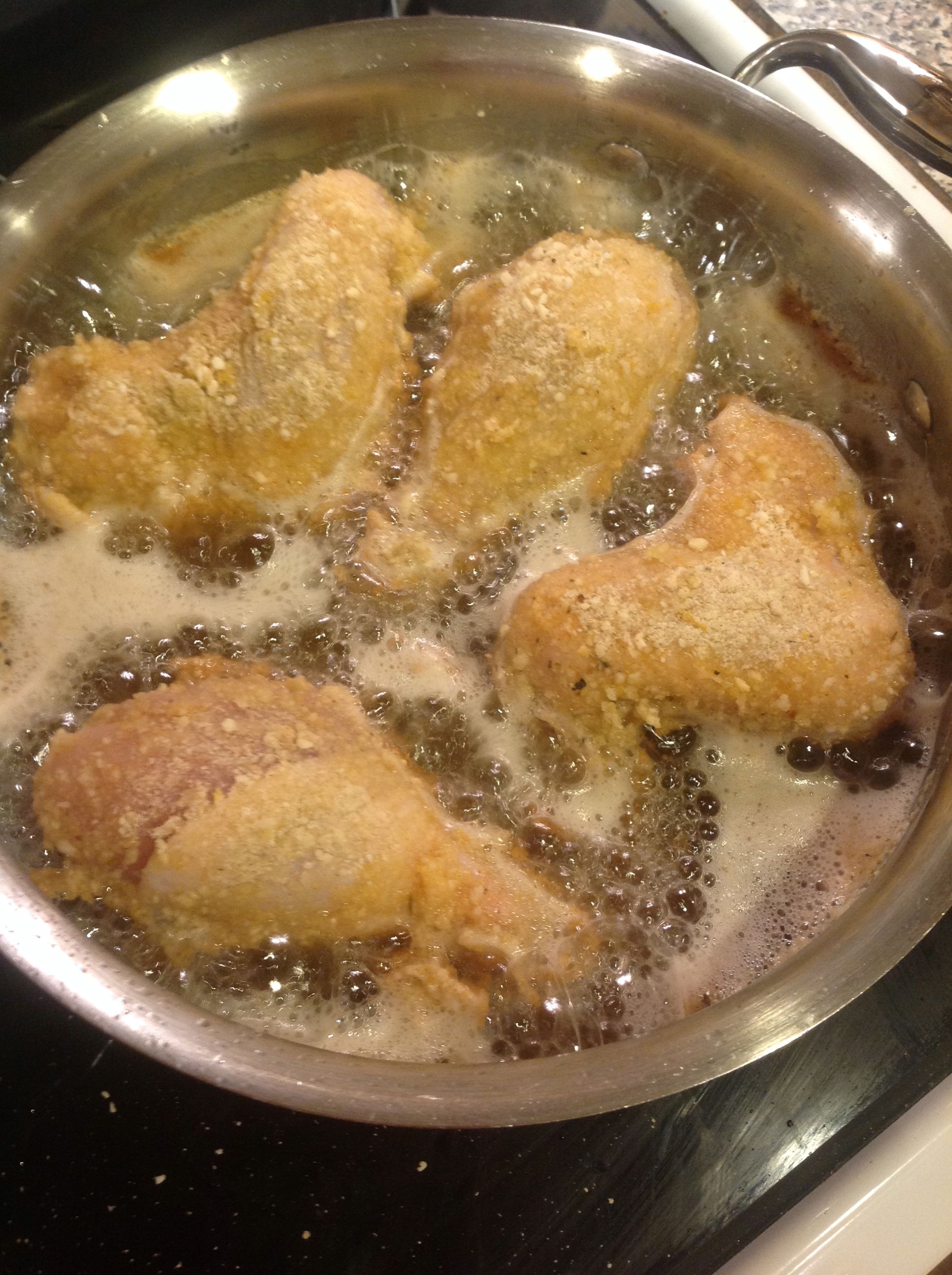 Repeat with all pieces of chicken, and fry at about 350 for between 8-12 minutes each side, depending on the size of the piece of chicken.