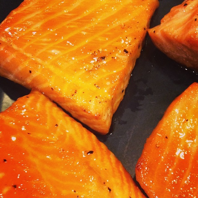I ended up on the Food Network, and watched someone make some amazing looking duck a l’orange. I don’t make a habit of keeping duck around, but I *did* have some salmon defrosting in the fridge. So, since duck and salmon are basically the same thing (?), I took a mental note of what this chef was doing, and filed it away in the “when I can hoist my ass off of the couch” folder.