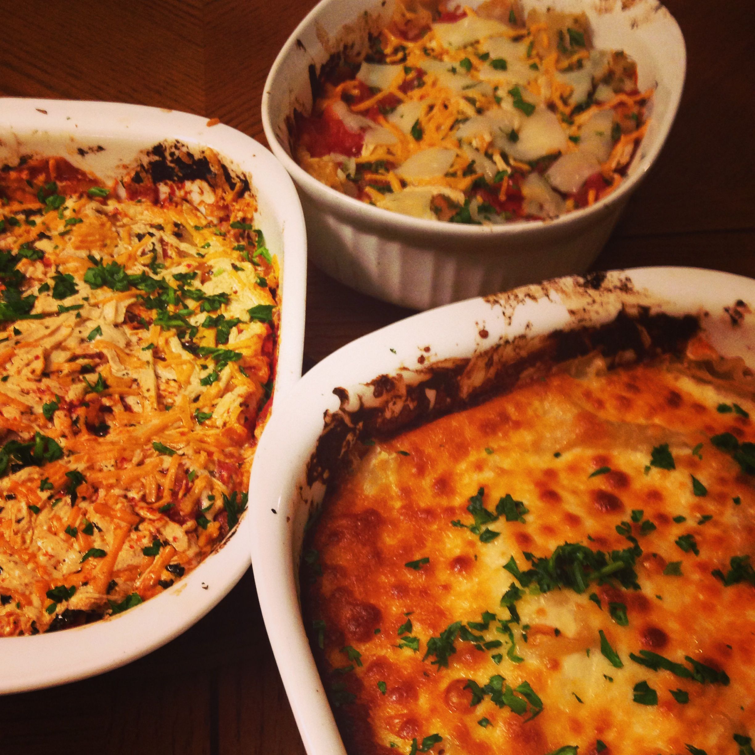 Three lasagnas for family dinner with all gluten free pasta. The big one is with meat and cheese, the medium is with meat and dairy free cheese, and the little one is no meat, no dairy, and no gluten.